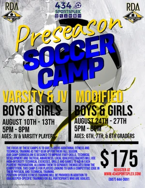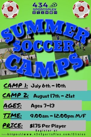 Week-long camp with skills training, scrimmages, and fun activities for players U6–U14.