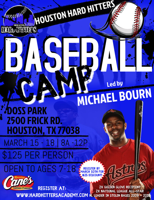 Week-long intensive camp covering hitting, pitching, fielding, and base running for players ages 8–14.